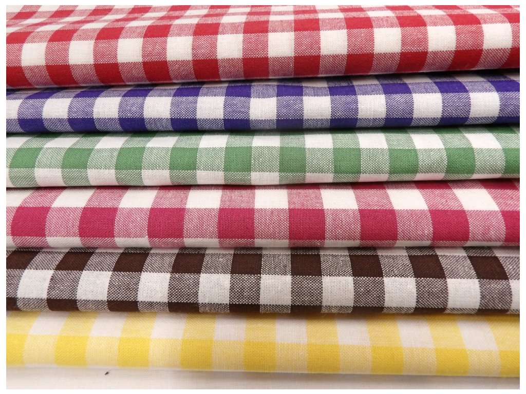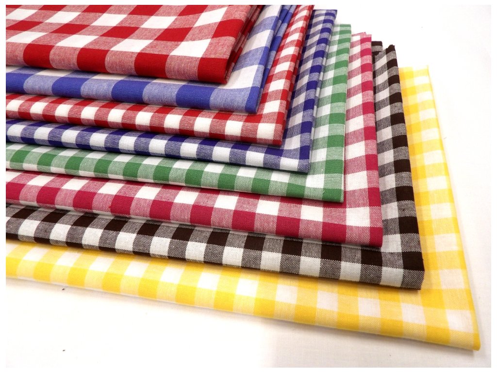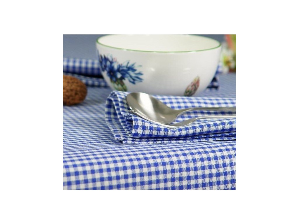 Kvalitní bavlněná žakárová tkanina v plátnové, pestře tkané vazbě, modro-bílá kostka 8-10mm, určená především pro výrobu ubrusů, zástěr, závěsů, retro povlečení a ostatního kuchyňského a domácího textilu.